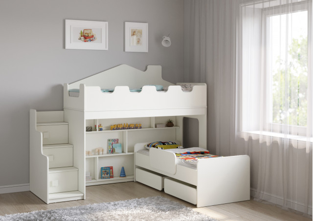Под верхним ярусом кровати находится большой стеллаж, который предоставляет достаточно места для хранения книг, игрушек и других вещей. Угловая лестница с тремя дверками обеспечивает удобный и безопасный доступ на верхний ярус. На боках кровати имеются световые окна, которые обеспечивают естественное освещение и создают атмосферу уюта.